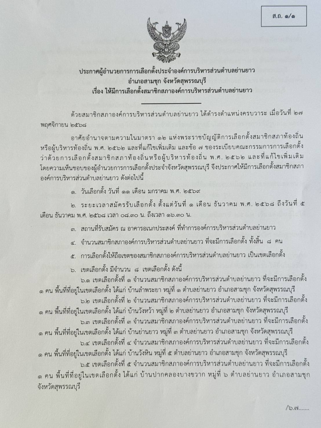 ประกาศผู้อำนวยการเลือกตั้งประจำองค์การบริหารส่วนตำบลย่านยาว ให้มีการเลือกตั้งสมาชิกองค์การบริหารส่วนตำบลย่านยาว