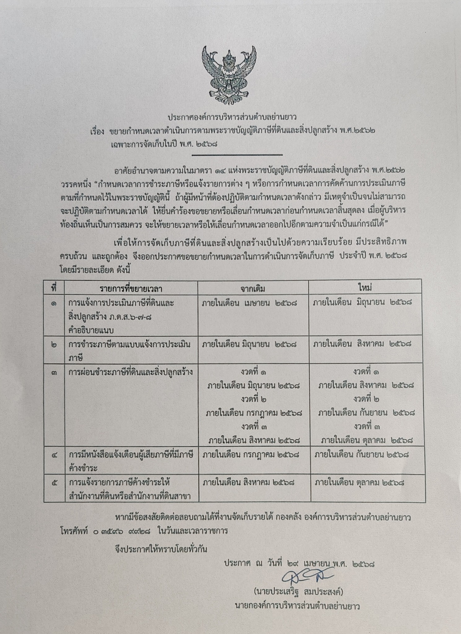 ประกาศ อบต.ย่านยาว ขยายกำหนดเวลาดำเนิรการตามพระราชบัญญัติภาษีที่ดินและสิ่งปลูกสร้าง พ.ศ 2562 เฉพาะการจัดเก็บในปี พ.ศ 2568