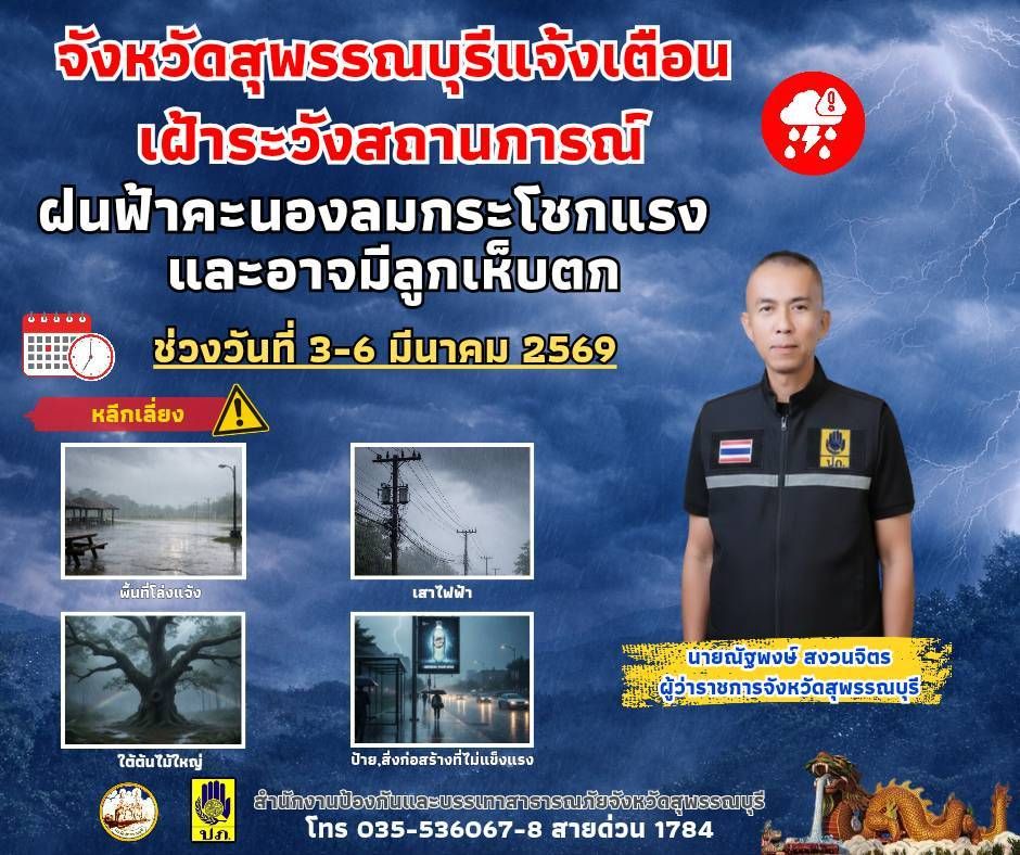 เฝ้าระวังสถานการณ์ ฝนฟ้าคะนองลมกระโชกแรง และอาจมีลูกเห็บตก ช่วง 3-6 มีนาคม 2569